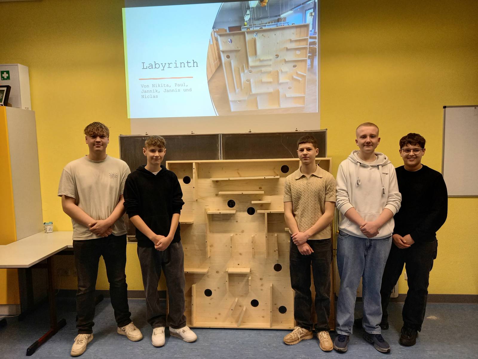 Kooperative Aufgabenstellungen gehören zum festen Repertoire des sozialen Kompetenztrainings. Geeignete Materialien sind meist teuer und können häufig nicht an die wechselnden Bedürfnisse von unterschiedlichen Altersgruppen angepasst werden. Deshalb nahmen Nikita, Jannis, Niclas, Paul und Jannik Kontakt zur Schulsozialarbeit auf und sprachen dort folgendes Projektvorhaben mit Frau Seifried ab: Die Planung, der Bau, die Erprobung und Optimierung eines flexiblen Kugellabyrinths, das in der Grundschule zum Einsatz kommen soll. Umgehend machten sich die fünf Jugendlichen an die Arbeit. Just in time wurde vor wenigen Tagen das fertige Labyrinth zusammen mit Schülerinnen und Schülern erprobt. Während ihrer Präsentation zeigten die Akteure bereits erste Anpassungsschritte, die sie aus den Rückmeldungen der Kinder abgeleitet hatten. Nach kleineren Restarbeiten soll das Labyrinth in den Fundus der Schulsozialarbeit übernommen werden.