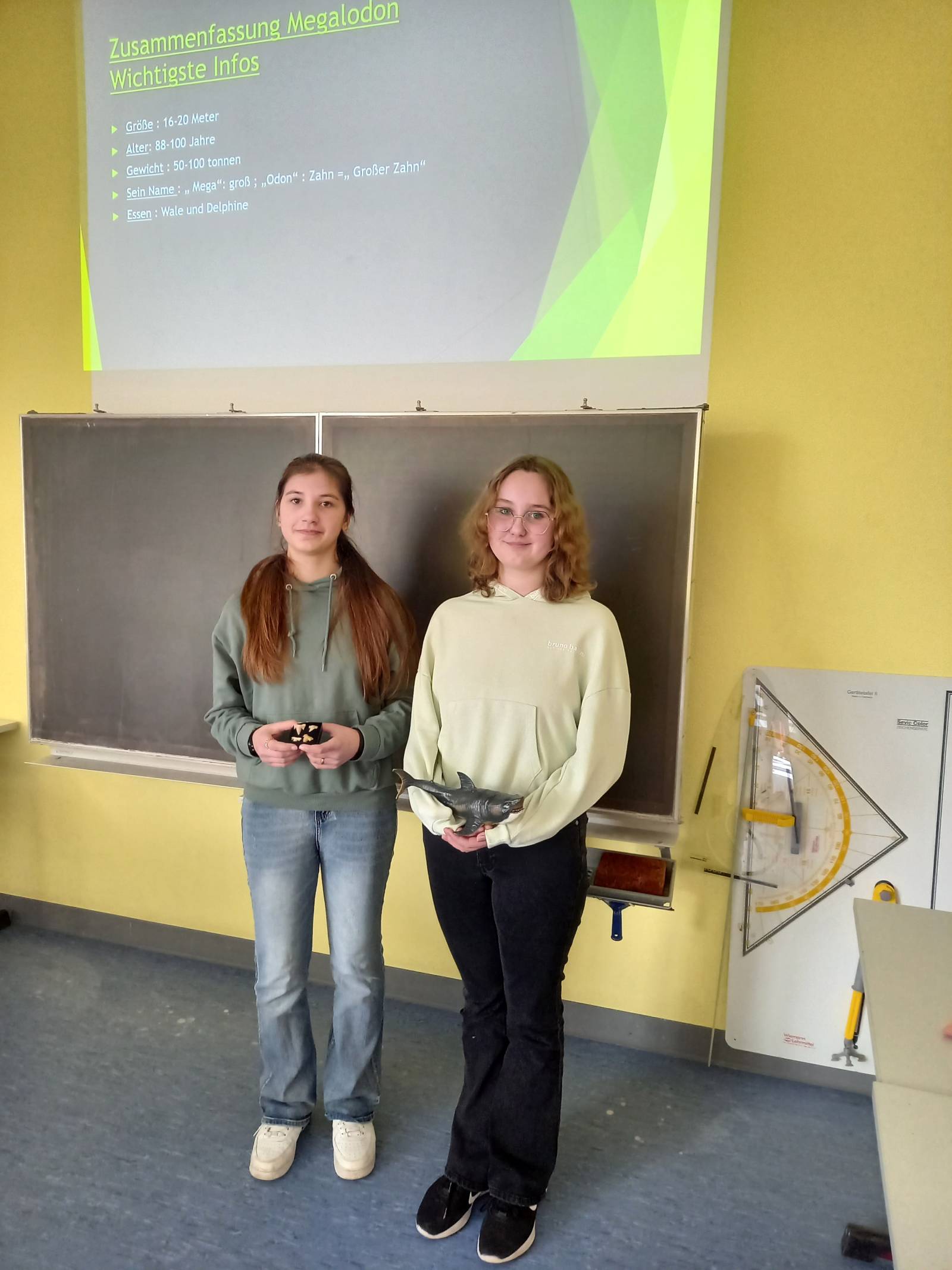 Wissenschaftler staunten nicht schlecht, als vor vielen Jahren erste fossile Hai-Zähne gefunden worden sind, die die Größe einer ausgestreckten Männer-Hand locker überragen. Rückschluss: Diese ungewöhnlich großen Zähne mussten zu einem riesigen Hai gehört haben. Hai-Arten von solchen Ausmaßen sind heute aber nicht mehr bekannt. Zudem ergaben Untersuchungen, dass die gefundenen Zähne aus einer längst vergangenen Epoche der Erdgeschichte stammen. Was war damals anders als heute? Neugierig widmeten sich Aimee und Samira dieser Frage. Nach und nach erschlossen sich die beiden Informationen zum Urzeit-Hai „Megalodon“, die sie in einer Präsentation bündelten. Fazit: Wirklich valide Erkenntnisse sind Mangelware. Allerdings gehören Haie zu sogenannten „lebenden Fossilien“, die sich seit vielen Zeit-Epochen kaum verändert haben. Daraus leitet man für den Megalodon Rückschlüsse und Thesen ab, die zwar im Bereich des Möglichen liegen, aber nicht mehr sicher überprüft werden können.