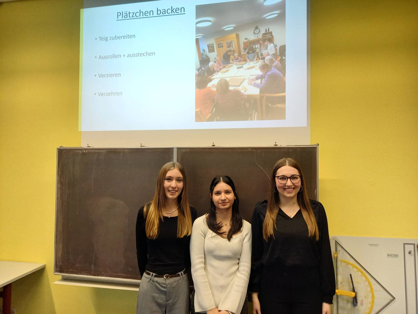 Der Alltag in Senioreneinrichtungen folgt oft einer gewissen Routine. Sina, Jasmin und Jessica nahmen sich vor, mit ihren Möglichkeiten für „frischen Wind“ zu sorgen und nahmen Kontakt zu einer entsprechenden Institution in Rottweil auf. Es folgten Treffen vor Ort, bei denen die drei Mädchen einen Eindruck vom täglichen Miteinander gewinnen konnten. Gemeinsam mit festen Ansprechpersonen wurden verschiedene Möglichkeiten besprochen, wie ein Engagement aussehen könnte. Die Gruppe entschied sich für die Gestaltung eines Tages im Advent. Dazu mussten unter anderem die strengen Hygienevorschriften des Hauses beachtet werden. Auch altersbedingte Einschränkungen wirkten sich auf die Ausgestaltung der Aktivitäten aus. Nach einer langen Vorbereitungsphase war es dann endlich soweit: Zusammen mit den Senioren realisierten die Schülerinnen eine Weihnachtsbäckerei, bei der es sehr gesellig zuging. Interessante Gespräche, überraschende Begegnungen und der Genuss des selbst fabrizierten Weihnachtsgebäcks prägten den Nachmittag. Ein weiterer Höhepunkt schloss sich an, als die Mädchen zusammen mit Betreuern und Senioren den Rottweiler Weihnachtsmarkt besuchten.