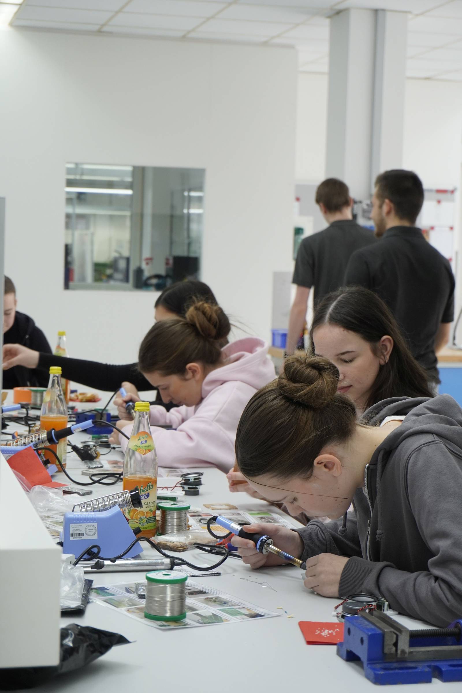 Die größte Gruppe besuchte dabei den Workshop bei den Mechatronikern. In deren Lehrwerkstatt wurden unter der fachlichen Anleitung der Azubis kompakte Bluetooth-Boxen konstruiert, die sich im Handy-Alltag der Schüler prima einsetzen lassen. Im Workshop der Industriekaufleute fanden sich neun Teilnehmer ein. Dort ging um die Vernetzung von Abläufen aus Kundenkommunikation, Auftragseingängen, Vertrieb, Produktion, Versand sowie Abrechnung. Im Bereich der Lagerlogistik agierte ein kleineres Team aus vier Schülern und durfte gleich tatkräftig mit zupacken. Wareneingang, Lagerhaltung und Warenausgang bleiben bei den Fachleuten stets unter voller Kontrolle. Zwei weitere Schüler bekamen Einblicke im Bereich der Maschinen- und Anlagenführung.