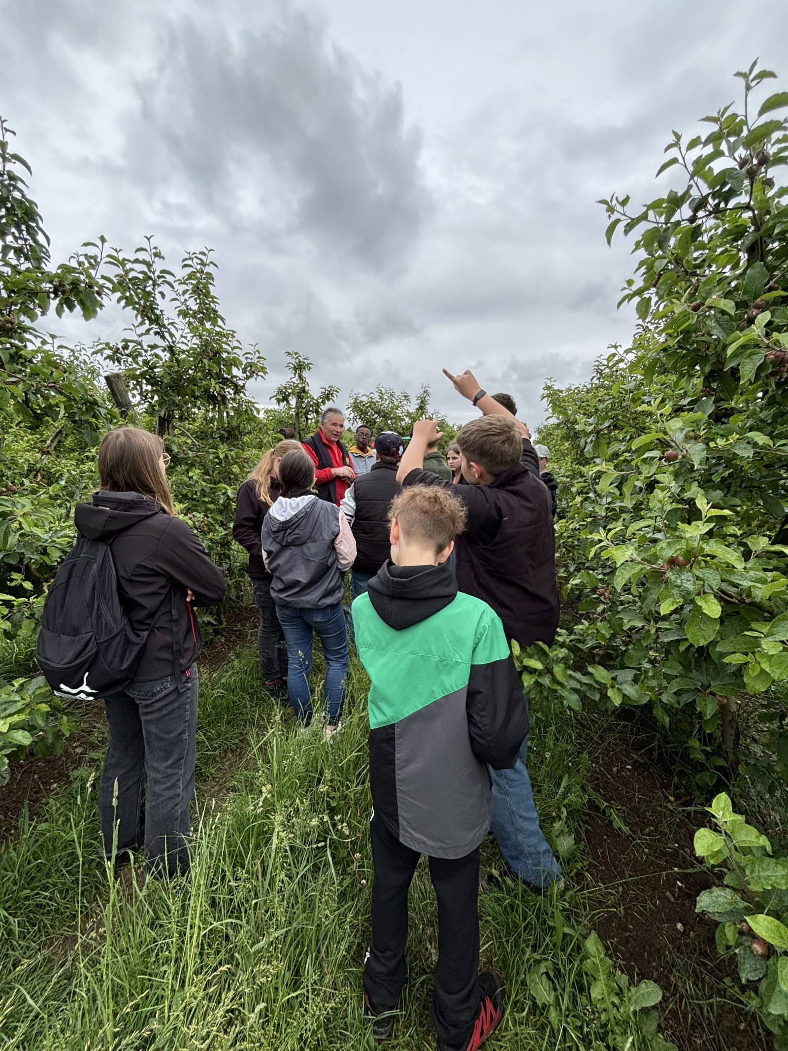 Die Anreise erfolgte mit Bus und Bahn, bevor wir von Herrn Hägele auf dem Magdalenenhof empfangen wurden. Los ging es mit einer fachkundigen Führung durch die weitläufigen Apfelplantagen. Herr Hägele erklärte anschaulich, wie die verschiedenen Apfelsorten angebaut, gepflegt und geerntet werden – natürlich durften auch Fragen gestellt und direkt in der Plantage beantwortet werden. Auch viele andere Obstsorten, wie Feigen, Brombeeren und sogar Pfirsiche waren dort zu entdecken.