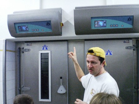 Herr Geiger zeigte uns als erstes einen großen Backofen, in den 12 Wägen mit Backwaren hineinpassen. Danach zeigte er uns einen Kühlschrank, in den 65 Wägen hineinpassen.