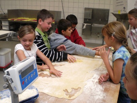 Bis das Eis fertig ist, dauert es eine Stunde. Als nächstes durfte jeder eine Figur aus Quarkteig ausstechen und eine Brezel backen.