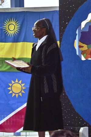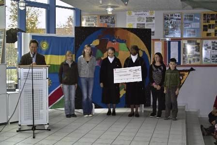 Als kleinen Schritt gegen diese Armut überreichten Schulsprecher und Klassensprecher der afrikanischen Schwester einen Scheck über 1150 Euro sowie den Erlös der Tombola von 571 Euro. Sichtlich bewegt nahm die Schwester die Spende entgegen und bedankte sich mehrfach. Mit dem Geld könne viel für die Armen getan werden, zu denen 80 Prozent der Menschen in Tansania zählen. Danach berichtete die schwarze Schwester über das Leben und ihre Arbeit in Tansania. Die Gemeinschaft der Barmherzigen Schwestern betreibt zahlreiche Kinderheime, Schulen, Kindergärten, Krankenstationen, Waisenhäuser, Heime für Behinderte, kümmert sich auch um Straßenkinder und betreibt eine Armenküche. Besonders die Lebensumstände der Gleichaltrigen waren für die Schüler interessant und so berichtete die Schwester darüber, dass trotz Schulpflicht viele Kinder nicht zur Schule gehen, weil sie das Schulgeld oder die Schuluniform nicht bezahlen können.