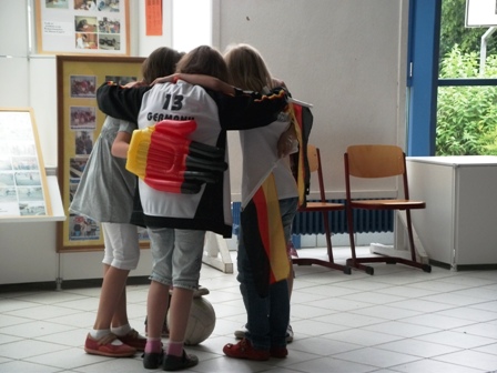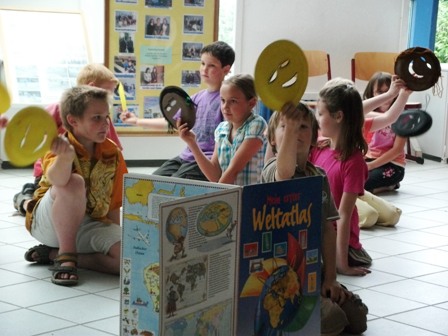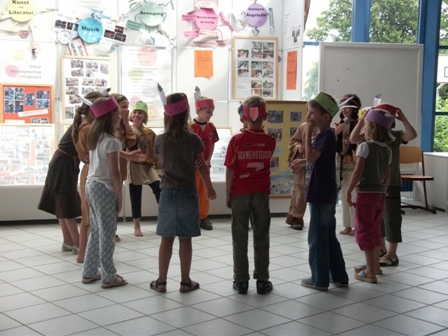 In der fünften Stunde des letzten Freitags vor Ferien war es wieder soweit: Alle Schülerinnen und Schüler sowie alle Lehrkräfte und auch einige Eltern versammelten sich zur Assembly in der Aula der Schule. Die Schülersprecherinnen Sabine und Vanessa führten durch das bunte und informative Programm. Geboten wurde ein Indianertanz der 2a, "We are the world" der Grundschulreligionskinder, ein Fußballweltmeisterschaftsrap, mehrere Stücke aus dem Klavierunterricht sowie ein beschwingter Auftritt der Jazztanzgruppe.