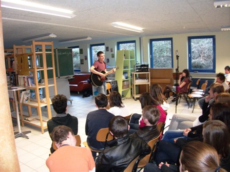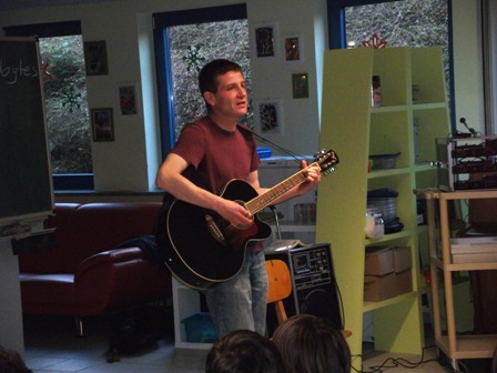 Doch schon nach wenigen Augenblicken schlägt Al Page, Autor des Romans „Brief an Selma“, die jungen Zuhörer mit lockeren Sprüchen in seinen Bann. Er liest nicht einfach vor, sondern er geht in Dialoge mit seiner jungen Zuhörerschaft, greift zur Gitarre und in die Klaviertasten. Dies alles gelingt ihm auf eine herrlich unverkrampfte und symphatische Weise. Der gebürtige Istanbuler ist im Schwarzwald aufgewachsen und findet die richtige Ansprache an die Kids. Die allermeisten im Publikum werden Rahel Bosse, Kl. 9 zustimmen: „Ich finde die Geschichte cool, der Autor ist witzig. Ich lese nicht gerne, aber auf dieses Buch freue ich mich“.