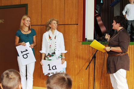 Im Theaterstück der Zweitklässler erlebten die Kinder mit „Anna und Benni“, wie die Zahlen und Buchstaben von den Zwergen und Häschen geklaut wurden. Am Ende wurden sie aber zum Glück wieder zurück gebracht, so dass die erste Schulstunde für die Klassen 1a und 1b beginnen konnte. Zusammen mit den neuen Erstklasslehrerinnen Frau Schmidt-Auginski und Frau Falk ging es in die Klassenzimmer, während die Eltern und Verwandten von Klasse 8 in der Aula bewirtet wurden.