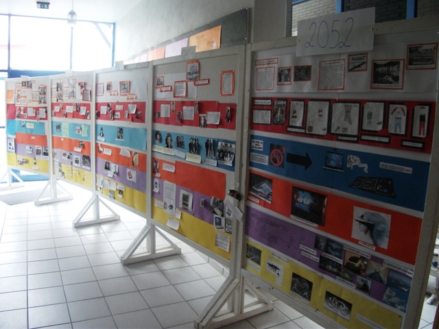 Unterstützt von Patrick Rieger, Blockpraktikant der Pädagogischen Hochschule Weingarten und ihrem Klassenlehrer Rainer Kropp-Kurta beschäftigten sich die Schülerinnen und Schüler der 9. Klasse zunächst mit den 50er bis 80er Jahren des 20. Jahrhunderts. Neben den politischen und wirtschaftlichen Entwicklungen recherchierten die Jugendlichen auch in den Themenfeldern Technik, Sport, Kultur und Unterhaltung, Mode und Musik und arbeiteten deren Entwicklungen in 40 Jahren, von der Gründung der Bundesrepublik bis zum Fall der Mauer, heraus. Diese wurde anschaulich über mehrere Meter an einem Zeitstrahl dargestellt. Als seitens des Statistischen Landesamtes die Frage nach der Entwicklung Baden-Württembergs in den nächsten 4 Jahrzehnten gestellt wurde, lag es nahe, sich dieser zu stellen. So entstand ein Wettbewerbsbeitrag in Form einer Verlängerung des Zeitstrahls mit einer Vision des Jahres 2052, der die Jury überzeugte.
