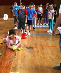 Die Schülerinnen der Klasse 8 und 9 haben sich zuvor in ihren Sportstunden unter der Leitung von Frau Müller verschiedene Stationen zum Thema Sommer ausgedacht, ausprobiert und mit Sommerutensilien dekoriert. Mit der Unterstützung der Klasse 9 wurden dann am Mittwochmorgen ein Summerfeeling mit z.B. Wellenreiten, Tauchen, Hula-Hopp, Floßfahrt und vieles mehr, in der Turnhalle geschaffen. Nach der Begrüßung wurden die Kinder von ihren Klassen- und Fachlehrern durch die Stationenlandschaft begleitet und auf der Laufkarte vermerkten die helfenden Neuner die Ergebnisse. Zur Stärkung konnte man sich in den Ruheraum oder in die Vormittagssonne zurückziehen. Die Kinder hatten großen Spaß und konnten alle Stationen ausprobieren. Als kleine Belohnung und zur Erinnerung an den unvergesslichen Sommersporttag bekam jede Klasse eine bunt gestaltete Urkunde überreicht.