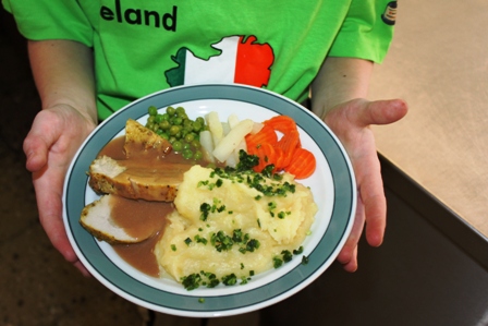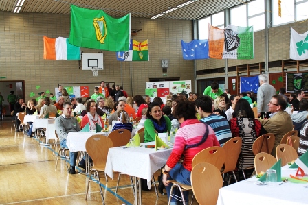 Über 160 Gäste konnten die 16 Schülerinnen und Schüler aus der „Irland-Klasse 7“ mit ihrem Klassenlehrer Stefan Bihl und den Lehrerinnen Tanja Besemer, Eugenia Remisch und Evelyn Roth mit allerlei irischen Spezialitäten verwöhnen. Kulinarisch war beim Drei-Gänge-Menü von Irish Stew (Irischem Lammeintopf), gemischtem Braten an Guinnesssoße, Salat mit Lachs, gefüllter Putenbrust bis hin zu Bailey´s Eis und irischem Schokokuchen so manche Leckerei geboten. Die jungen Köche verarbeiteten dabei über 200 Kilogramm an Lebensmitteln.