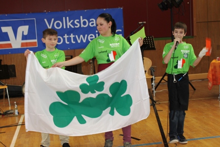 Begrüßt wurden die Besucher des „Irischen Dinners“ zunächst mit dem grellgrünen Getränk „Irish Mist“. Überhaupt war Grün die dominierende Farbe des Nachmittags. Während in Dublin, Chicago und anderen Großstädten Irlands und der USA am St. Patrick´s Day sogar die Flüsse grün gefärbt werden, zeigte sich auch die Villingendorfer Turn- und Festhalle liebevoll geschmückt. Neben dem irischen Flaggenmeer und den so typischen Kleeblättern konnten sich die Besucher über Land und Leute genauso informieren, wie über das Tun der Schülerfirma der Irland-Klasse. Für die Siebtklässler gilt es nämlich eine Klassenfahrt auf die grüne Insel weitgehend eigenständig zu finanzieren. Dafür bieten sie bereits seit Schuljahresbeginn ihre Dienste an, waschen beispielsweise Autos oder führen Hunde aus. Vor allem aber sind sie bei verschiedenen Caterings aktiv oder sie verkauften Selbstgemachtes auf dem Weihnachtsmarkt. Dabei werden sie einerseits durch die Würth-Stiftung unterstützt, wo die Klasse mit ihrem Projekt am stiftungseigenen und mit 5.000 Euro dotierten Förderkreis teilnimmt. Andererseits begleitet der schulische Bildungspartner Volksbank Rottweil eG mit zwei engagierten Auszubildenden, Denise Henselmann und Kevin Boos, die Schülerfirma mit Rat und Tat. Aus der 7. Klasse entstand eine regelrechte Firma, mit Vorstand, und Finanz-, Marketing, Produktions- und Dienstleistungsabteilung in Form einer Genossenschaft, wie Jonas Fruh den Gästen in einem Kurzvortrag erläuterte.