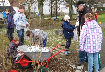 Alle Baumsetzlinge konnten am 12. April 2013 mit Unterstützung des Hausmeisters gepflanzt werden. Zwei Holzapfel-Bäume sowie eine Wildkirsche fanden ihren Platz auf dem Schulgelände. Mit Spaten, Heckenscheren und Gießkannen ausgerüstet, machten sich die Schülerinnen und Schüler voller Eifer an die Pflanzaktion. Schon nach kurzer Zeit waren die Bäumchen gepflanzt. Des Weiteren wurden Baumpaten ernannt, die sich in der nächsten Zeit um die Setzlinge kümmern, denn die Hege und Pflege gehört ebenfalls zu diesem Projekt.