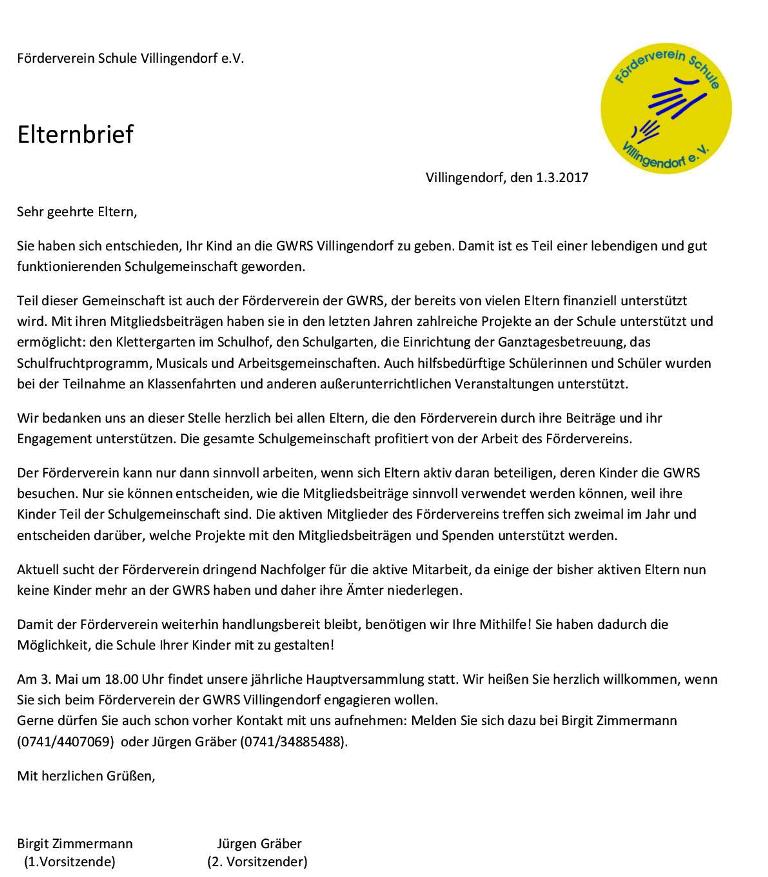Brief des Vorstands des Schulfördervereins