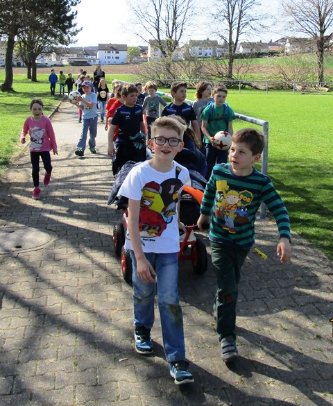 Die Osterferienbetreuung hatte auch dieses Jahr wieder einiges zu bieten. Der Wettergott war der Betreuung wohlgesonnen, so dass viel Zeit im Freien verbracht werden konnte. Vom 10. bis zum 13. April startete die Betreuung für die 29 angemeldeten Kinder täglich mit einem Hörspiel und einem anschließenden gemeinsamen Frühstück. Gleich am ersten Tag ging es mit dem Bollerwagen auf in Richtung Bergwaldspielplatz. Auf dem Weg dorthin wurde ein Halt am Sportplatz gemacht, wo sich die Kinder auf der benachbarten Wiese beim Fußballspielen sowie auf der Halfpipe beim Klettern und Rutschen austoben konnten.