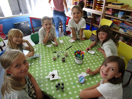 Jeden Tag von 7.30 Uhr bis 14.00 Uhr wurde gebastelt, gespielt und gebacken. Jeden Morgen starteten alle mit einem gemeinsamen Frühstück in den Tag. Nach einer kurzen Spielpause auf dem Schulhof gab es dann täglich wechselnde Angebote wie Seifengießen, Pizza backen, Ausflüge zum Fußballplatz oder Bergwaldspielplatz, einen Kinovormittag, Basteln mit Muscheln, Bemalen von Steinen und vielem mehr.