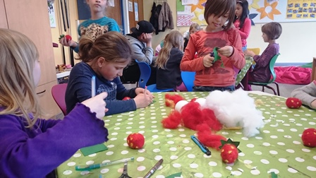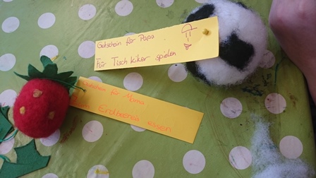 Ein kleines Geschenk für die Eltern am Mutter- und Vatertag bastelten 18 Kinder am Mittwoch den 04.05.2016 in der Betreuung. Für die Mama wurde aus Filz und einem Styroporei eine Erdbeere gebastelt, für den Papa ein Ball. Dazu hefteten die Kinder einen Gutschein zum Erdbeereis essen und einen zum Ball spielen. Alle Kinder waren hochmotiviert und freuten sich darauf, das Geschenk an ihre Eltern überreichen zu können.