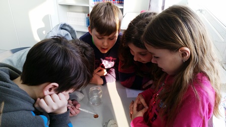 Bei unserer Mittwochsaktion „Spannende Experimente“ dürften die kleinen Forscher an verschiedenen Tischen selbst experimentieren. Schmilzt Eis mit oder ohne Salz schneller und warum ist das so? Wie viele Tropfen Wasser kann man auf eine Cent-Münze geben, bevor es runterfließt? Von Geheimschrift, über Filterpapierbilder gab es auch einige handfeste Ergebnisse.
