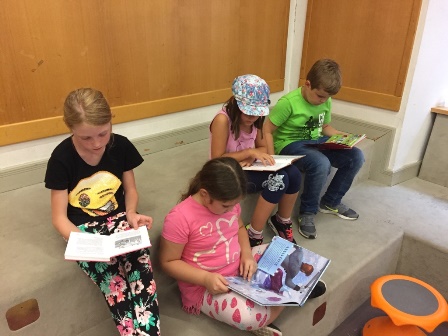 Anschließend nutzten die Kinder die Zeit, um sich selbst ein Buch ihrer Wahl anzuschauen. Sie tauschten sich aus oder schauten gemeinsam Bilder an, während sich manche wiederum auf die Sitzsäcke zurückzogen und ein Buch lasen. Mit dem Bus ging es dann um kurz vor 17.00 Uhr zurück zur Schule. Die Mittwochsaktion war für alle eine tolle Gelegenheit, die Stadtbücherei näher kennen lernen zu können.