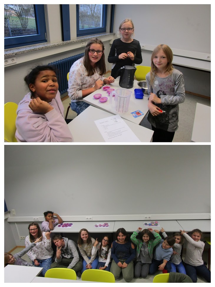Die Gesundheit und Wellnessgruppe stellte eigene Dusch-Jellys her. Diese seifenähnlichen, bunten Dusch-Accessoires sind gerade voll im Trend. In drei Gruppen wurde eine Mischung aus Duschgel und anderen Zutaten hergestellt und in Silikonformen gegossen und in der Wunschfarbe jedes Schülers eingefärbt. Nach einer nächtlichen Ruhezeit konnten die individuell gestalteten Jellys am nächsten Tag dann mit nach Hause genommen werden.