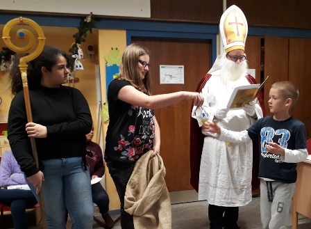Der Nikolaus besuchte auch die Kinder im Ganztag. Zur Begrüßung sangen die Schülerinnen und Schüler gemeinsam mit Leiterin Jessica Wolff und Erzieherin Lisa-Marie Bauer „Lasst uns froh und munter sein“, ehe der Nikolaus zu jedem Kind eine individuelle Rückmeldung gab und kleine Geschenke verteilte.