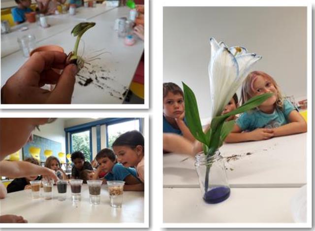 Und es war ganz toll von allen teilnehmenden Kindern, das sie nicht vergessen hatten ihre Gläser mitzubringen, in denen ihre Bohnen eine Woche keimen konnten. An dieser weißen Lilie konnten die Kinder wunderbar erkennen, wie Pflanzen durch die Kapillarität Wasser aufsteigen lassen.