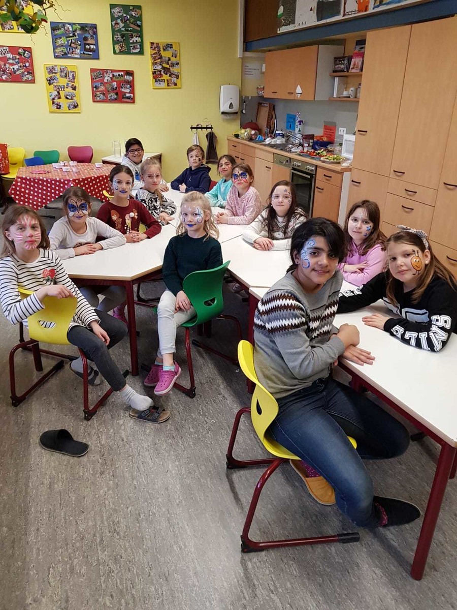 Am vergangenen Mittwoch ging es im Ganztag unserer Schule schon närrisch her. So durften sich sämtliche Kinder von Katja schminken lassen. Egal ob Prinzessin, Katze, Tiger, Spinne oder eine Fantasyfigur - es blieben keine Wünsche offen. Sogar die großen Schülerinnen waren begeistert mit dabei und ließen sich ein Freundschaftstattoo aufmalen und Ohrringe aufkleben.