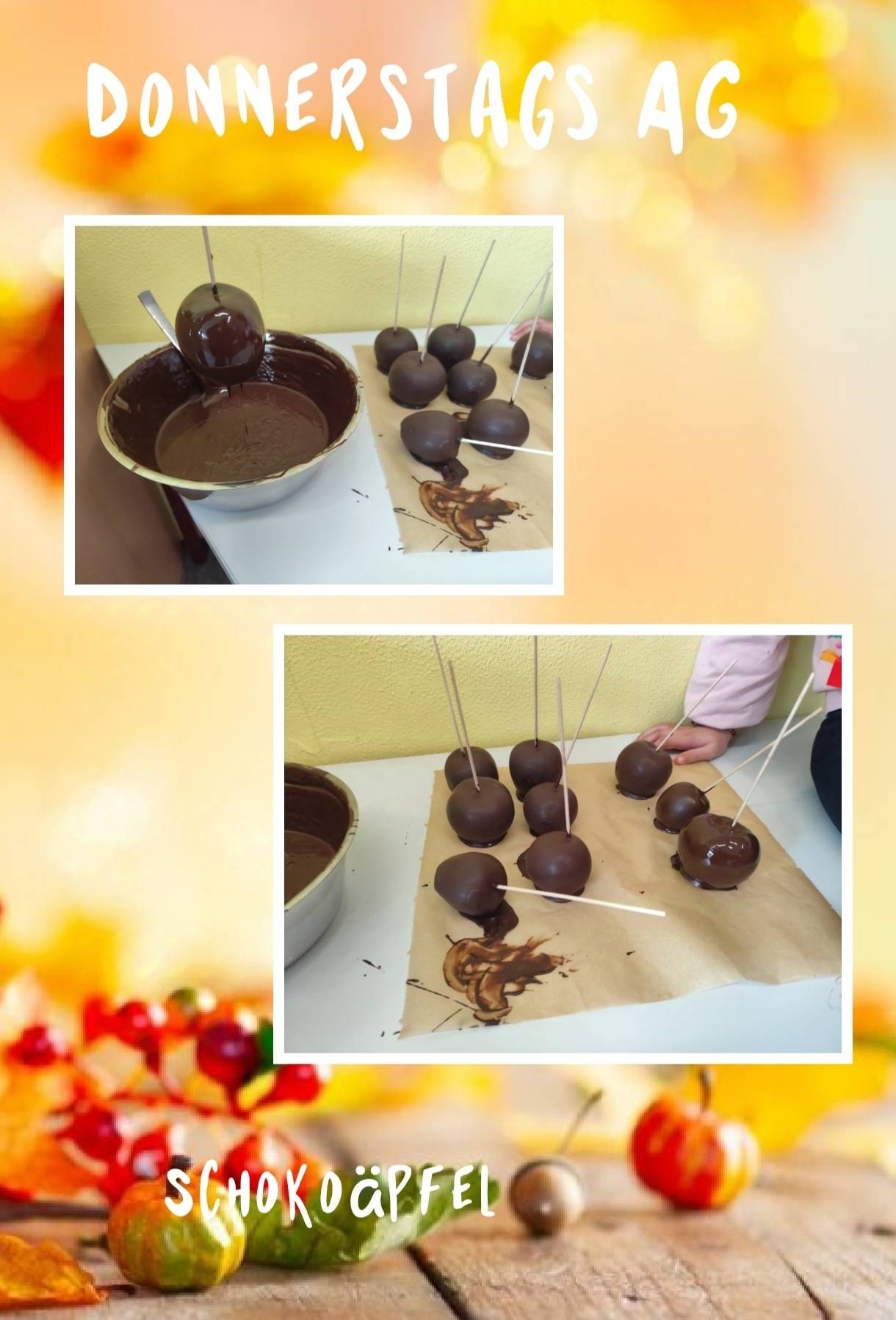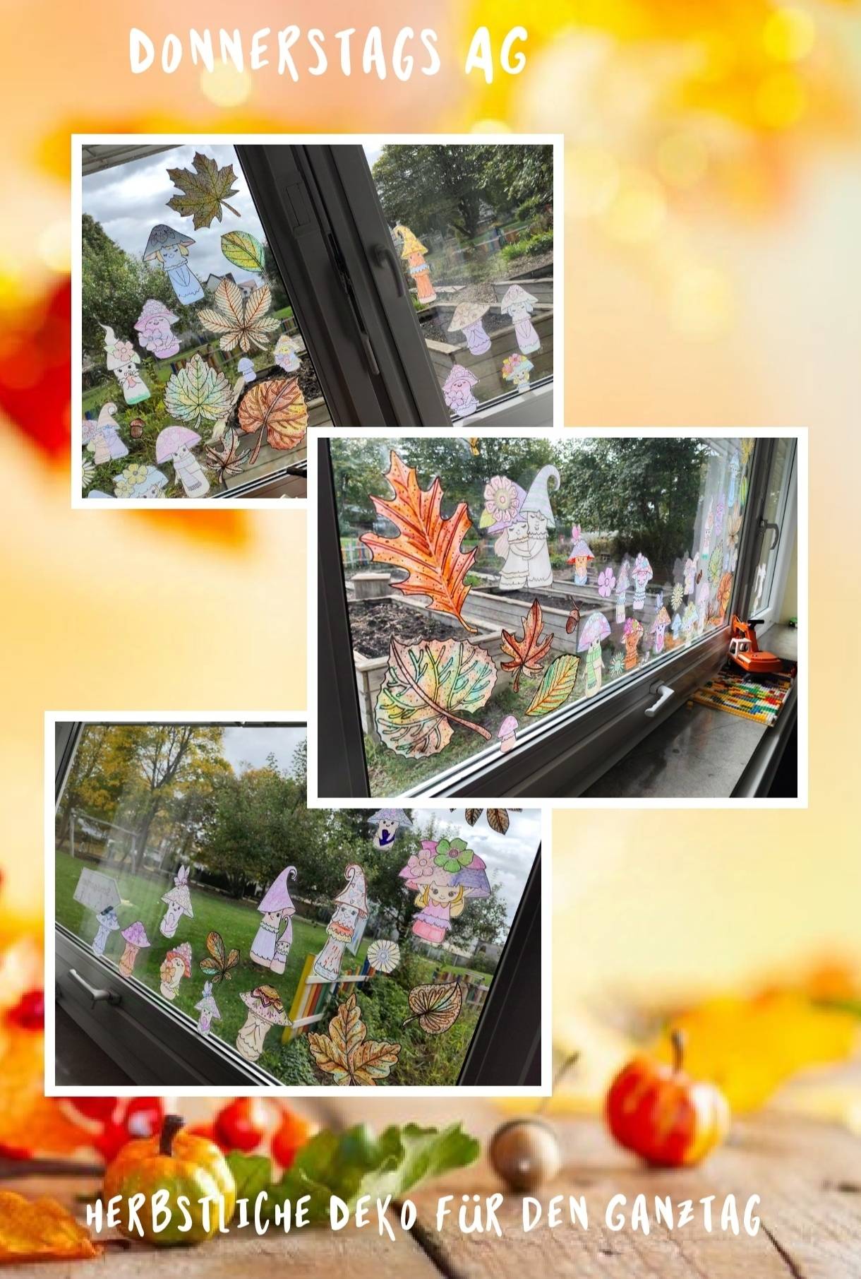 Auch die AG's fanden allmählich wieder im Schulhaus statt. Über mehrere Wochen wurde eines der großen Fenster im Ganztag herbstlich gestaltet, bevor die Schülerinnen und Schüler mit leckeren Schokoäpfeln in die Herbstferien entlassen wurden.