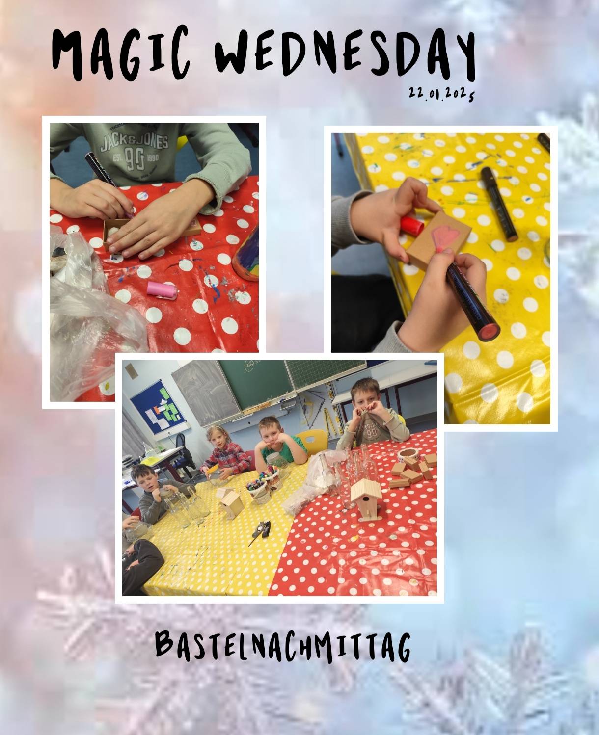 Das Wetter machte am dritten Magic Wednesday im Jahr 2025 leider einen großen Strich durch die Planung der Ganztagesbetreuung. Eigentlich war ein Wintertag geplant, das Wetter war hierzu aber viel zu mild, matschig und regnerisch. Kurzerhand entschied man sich dazu, die Schränke nach Materialien durchzuforsten. So wurde alles, was es zu finden gab, zusammengetragen, bevor die Schülerinnen und Schüler im Anschluss ihrer Kreativität freien Lauf lassen durften. So sind tolle bemalte Gläser, Vogelhäuser, Tontöpfchen und Schatullen entstanden.