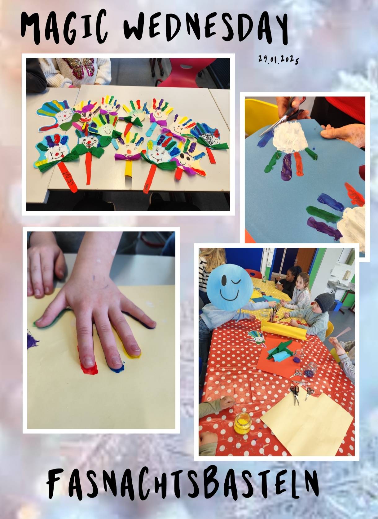 Am letzten Mittwoch im Januar wurde die anstehende Fasnet eingeläutet. Lustige Clowns aus Handabdrücken wurden mit viel Liebe zum Detail gebastelt. Die Betreuungskinder hatten eine Menge Spaß und die Ergebnisse waren großartig. Auch diesen Magic Wednesday beendeten die Kinder nebst Betreuungsteam mit einem gemeinsamen, gesunden Snack.