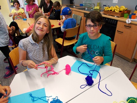 Dank Frau Besemer entstanden aus den langen Wollkorderln tolle Fingerhäkel-Bilder! Der Kreativität der Kinder waren dabei keine Grenzen gesetzt.