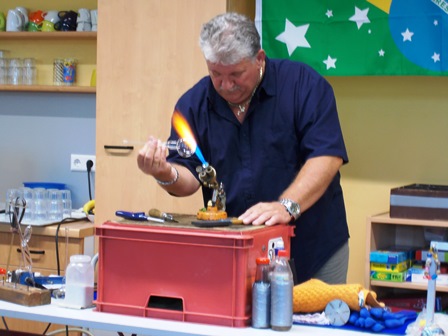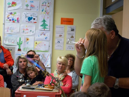 Am vergangenen Mittwoch war Glasbläser Wolfgang Sinne zu Besuch in der Ganztagesbetreuung. Herr Sinne brachte den Kindern und Eltern die alte Tradition des Glasblasens näher und lieferte interessante Informationen rund um das Thema Glas. Kindgerecht erläuterte er in seiner Vorführung die Kunst des Glasformens und zauberte kurzerhand eine Vase und ein filigranen Schwan.