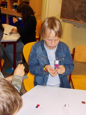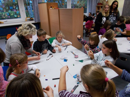 Schmuck basteln war das Thema der Mittwochsaktion in dieser Woche. So durfte die Ganztagesbetreuung um 14.30 Uhr wieder jede Menge Kinder begrüßen. Aber dieses Mal wurden keine Perlen zum Herstellen von Armbändern benutzt sondern viele bunte, große und kleine Knöpfe.