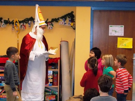 Bei dieser Mittwochsaktion war der Nikolaus zu Besuch in der Ganztagesbetreuung. Etwa 50 Kinder waren ganz gespannt als sie um halb drei in den Betreuungsraum gekommen sind, da sie nicht genau wussten, was sie heute erwartet. Als gemeinsam „Lasst uns froh und munter sein“ gesungen wurde klopfte es auch schon an der Türe und der Nikolaus kam herein.