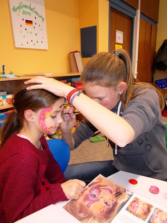 Während die eine Hälfte der Kinder geschminkt wurde, haben die anderen bunte Masken gebastelt, so dass der Fasnacht nichts mehr im Wege steht.