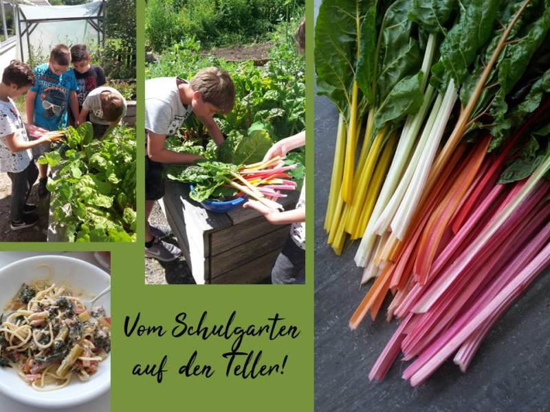 Für die Nahrungszubereitung im HTW-Unterricht ernteten wir diese Woche den Mangold im Schulgarten. Über die Farbintensität der Mangoldstiele waren wir so begeistert, dass das Kochen erstmals in den Hintergrund rückte. Genussvoll aßen wir am Ende unsere Mangold-Spagetti.