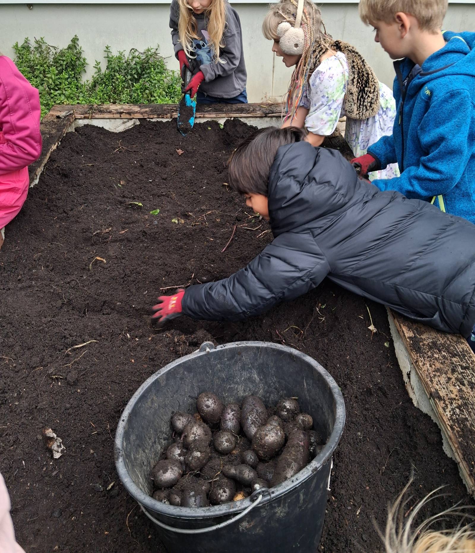 Das Gartenjahr neigt sich langsam dem Ende zu und zur Freude der neuen Gartenklassen konnten noch reichlich Kartoffeln geerntet werden. Stolz wurden zwei Eimer voll „bunter“ Kartoffeln zusammengesammelt. Nun wird der Schulgarten in den nächsten Wochen noch für den Winter vorbereitet und die angehenden Gärtnerinnen und Gärtner widmen sich in dieser Zeit allerlei wichtigen Themen und Grundlagen rund um den Garten: Pflanzenwachstum, Ökosystem, Artenkenntnisse Gemüse und Obst, Wildkräuter, der Garten im Wandel der Jahreszeiten und vieles mehr. Auch eine gemütliche Teestunde mit selbstgeerntetem Kräutertee und kreatives Gestalten mit Naturmaterialien gehören dazu.