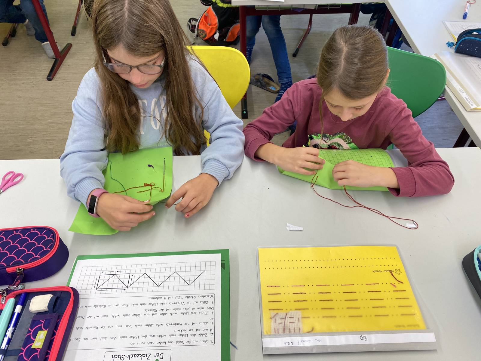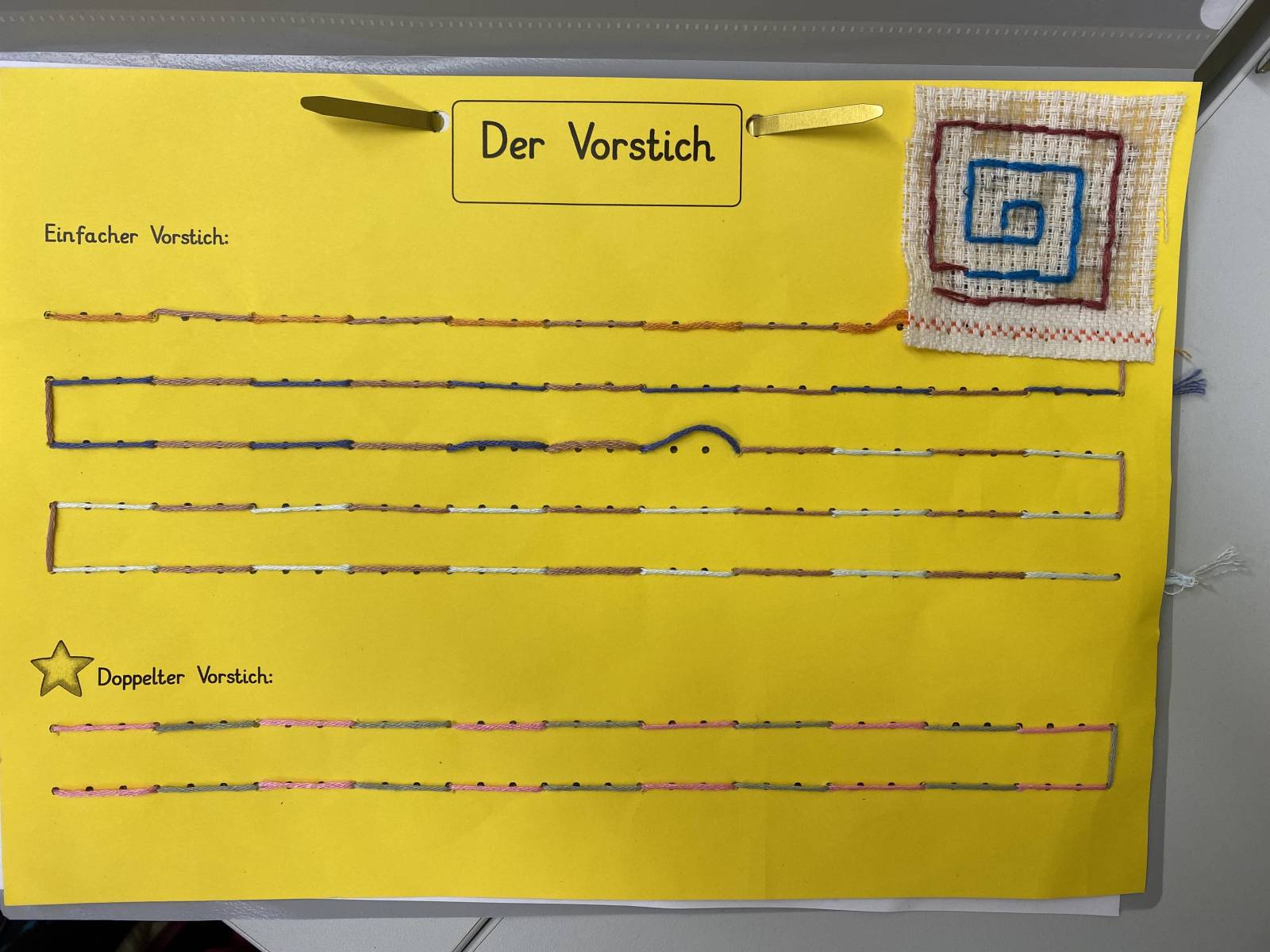 Im TOP „Sticken" haben wir zu Beginn das Einfädeln in verschieden große Nadeln geübt. Dabei haben wir einige Tricks gelernt, die das Einfädeln vereinfachen. Anschließend haben wir den Vorstich und den Zickzackstich kennengelernt. Diese beiden Stickarten haben wir mit Hilfe einer Schritt-für-Schritt Musterkartenanleitung zuerst auf dem Papier, dann mit einem Jutestoff geübt. Vor allem mit dem Zickzackstich kann man interessante Muster erstellen. Durch fleißiges Üben haben wir unsere Stickkünste verbessert und konnten tolle Kunstwerke schaffen!