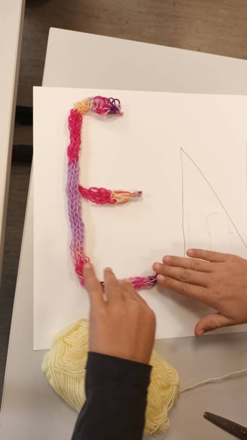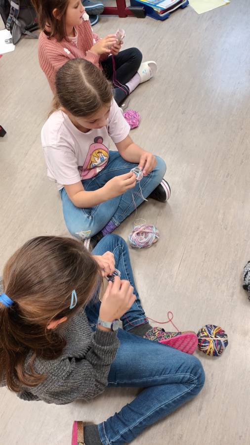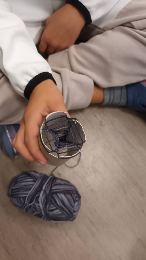 Umweltbewusst und nachhaltig – die Schülerinnen und Schüler der Klasse 3 und 4 nutzen Klopapierrollen als Stricklieseln und Schaschlickspieße als Stricknadeln, um erste Erfahrungen mit dem Stricken zu sammeln.