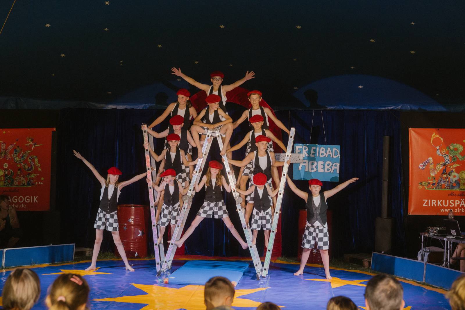 Am Freitag, den 11. Juli 2025 war es endlich soweit. Eine ganze Woche lang haben 250 Mädchen und Jungen der GWRS Villingendorf für den großen Moment des Zirkusauftritts geprobt. Angeleitet von den Zirkuspädagoginnen des Zirkus Abeba, tauchten die Schülerinnen und Schüler der Klassen 1 bis 6 tief in die Welt des Zirkuslebens ein. In 20 verschiedenen Themengruppen übten die Nachwuchskünstler eifrig mit den Lehrkräften der GWRS, um am Freitagnachmittag schließlich vor insgesamt rund 1.000 Besuchern ihr Können zur Schau zu stellen. In einer höchst abwechslungsreichen Show von eineinhalb Stunden zeigten die Kinder, was sie gelernt hatten und ernteten tosenden Applaus. Die Schülerinnen und Schüler ließen wirklich nichts aus, was zu einer großartigen Zirkusaufführung gehört: waghalsige Luftakrobatik mit Ring, Trapez und Vertikaltuch ebenso wie filigrane Darbietungen der Balance und Hula-Hoop Gruppe. Natürlich durften auch lustige Clowns, die Nummernansage und faszinierende Zauberei nicht fehlen. Unterhaltsame Leiterakrobatik oder mutige Fakire und Feuerjonglage wechselten sich mit Trampolin und Seilspringen ab. Abgerundet wurde das vielfältige Programm mit Pantomimeszenen, Poi und Staff, Jonglage und Tanz.
