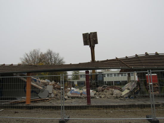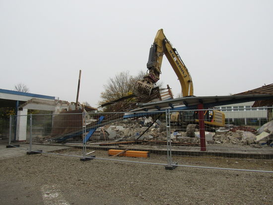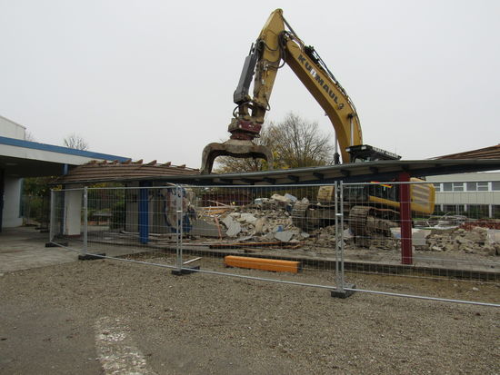 In den schulischen Herbstferien leistet ein Abrissunternehmen ganze Arbeit. Stück um Stück wird der ehemalige Zwischentrakt zwischen der Grund- und Werkrealschule demontiert und nach Altmetall, Altholz und anderen Wertstoffen getrennt, teilweise geschreddert und dann recycelt. Die Pausenhalle beherbergte zuvor die Toilettenanlage, das Schülercafé und die Werkstatt des Hausmeisters, wofür jeweils adäquater Ersatz auf dem Schulgelände gefunden werden konnte.
