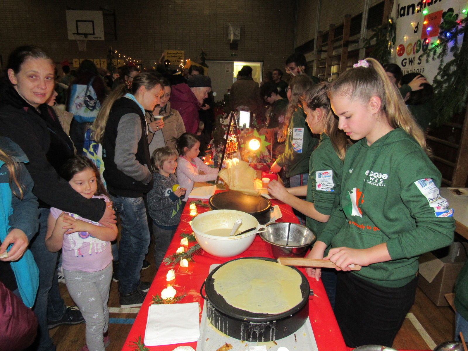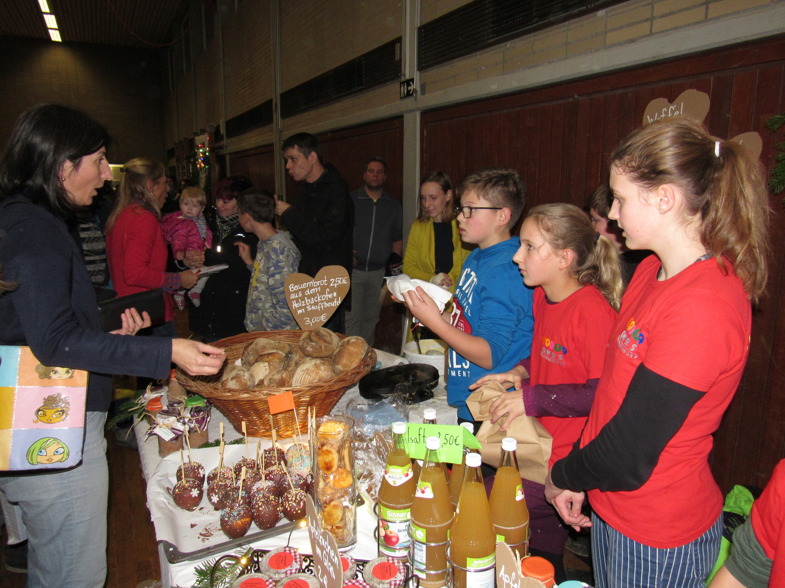 Eröffnet wurde das bunte Markttreiben durch die wieder eingeführte Bläserklasse unter Leitung des Dirigenten Joachim Mager und den Grundschulchor unter Leitung von Musiklehrerin Kathrin Schwarz sowie der musikalischen Sozialwerkstatt mit englischsprachigen Weihnachtsliedern, begleitet und geleitet von der Musikerin und Englischlehrerin Lynda Cullen.