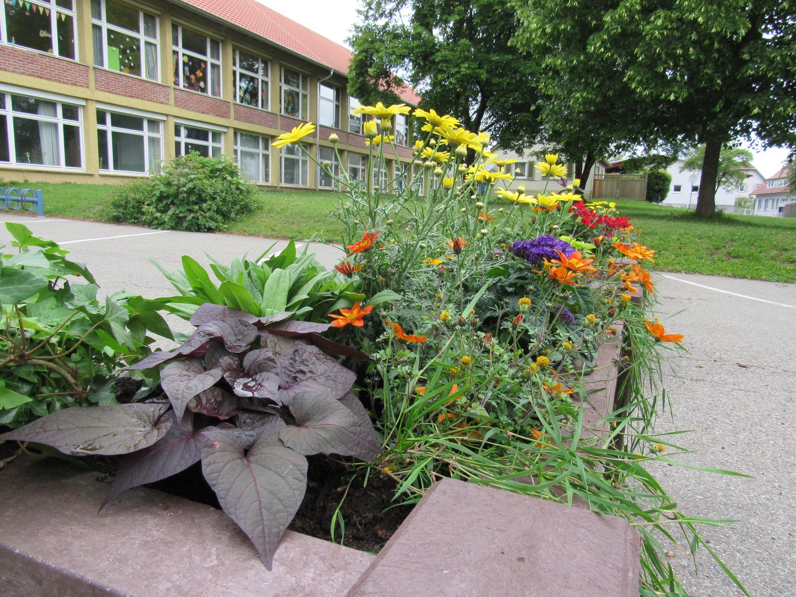 So entstand dank der Tatkraft der Mitarbeiter des Bauhofs eine schmucke Abtrennung aus Pollern und Blumenkübeln. Diese wurden nun in den Pfingstferien von der Lehrerin Flurina Zeller geschmackvoll bepflanzt. Die Lehrkraft zeichnet sich auch federführend für die Gestaltung des Schulgartens verantwortlich. Die als Provisorium für den Zeitraum der Baustelle des Hallenneubaus gedachte Gestaltung ist mehr als vorzeigbar, freuten sich die Vertreter der Schule. Schulleiter Rainer Kropp-Kurta bedankte sich ausdrücklich bei der Gemeindeverwaltung, allen voran bei Bürgermeister Marcus Türk. Auch im Hinblick auf die Hygiene- und Abstandsregeln durch Covid-19 sei die Umsetzung genau zur rechten Zeit gekommen.