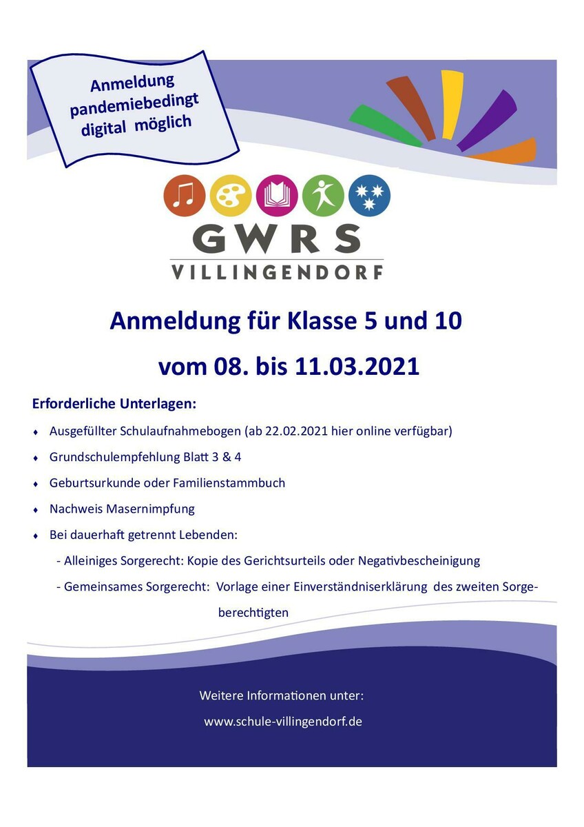 vom 08.03. bis 11.03.2021 haben Sie die Möglichkeit, Ihr Kind für die Klasse 5 an er GWRS anzumelden. Pandemiebedingt ist es in diesem Jahr auch möglich, die Anmeldung digital durchzuführen.