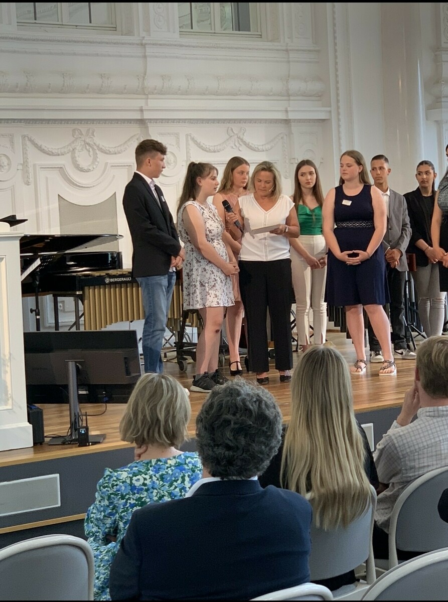 2022 07 05 Landespreis 32022 07 05 Landespreis 2Der Landespreis der Werkrealschule wird seit zehn Jahren an besonders engagierte Schülerinnen und Schüler mit überdurchschnittlich guten fachlichen Leistungen verliehen. Im Schuljahr 2021/2022 ist dabei die Umsetzung der Leitperspektiven „Berufliche Orientierung“, „Bildung für Toleranz und Akzeptanz von Vielfalt“, „Bildung für nachhaltige Entwicklung“, „Medienbildung“ oder „Verbraucherbildung“ von zentraler Bedeutung. Sechs Abschlussschülerinnen und –schüler der GWRS Villingendorf durften ihre Urkunden am 04. Juli von Kultusministerin Theresa Schopper in Empfang nehmen: Lea Kellinger (Engagement im Projektteam „Fluthilfe für das Ahrtal“) und Madlen Schüssler, Jasmin Moser, Tim Denkinger, Anna Maria Warda sowie Denisa Spahic für ihren Einsatz rund um das berufliche Sozialprojekt „Irlandklasse“. Die Verleihung fand im feierlichen Rahmen des Weißen Saals im Neuen Schloss Stuttgart statt.