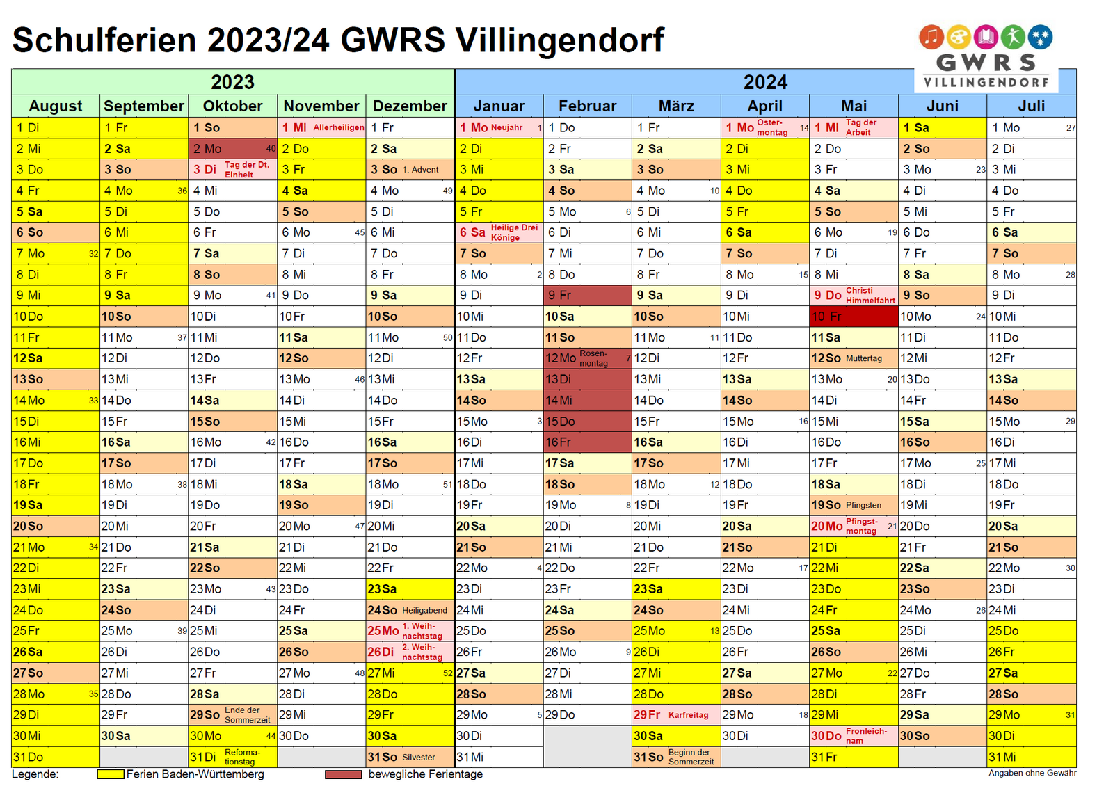 Die GWRS Villingendorf folgt grundsätzlich der Ferienplanung der Rottweiler Schulen. Diese haben sich nun auf den folgenden Ferienplan geeinigt: