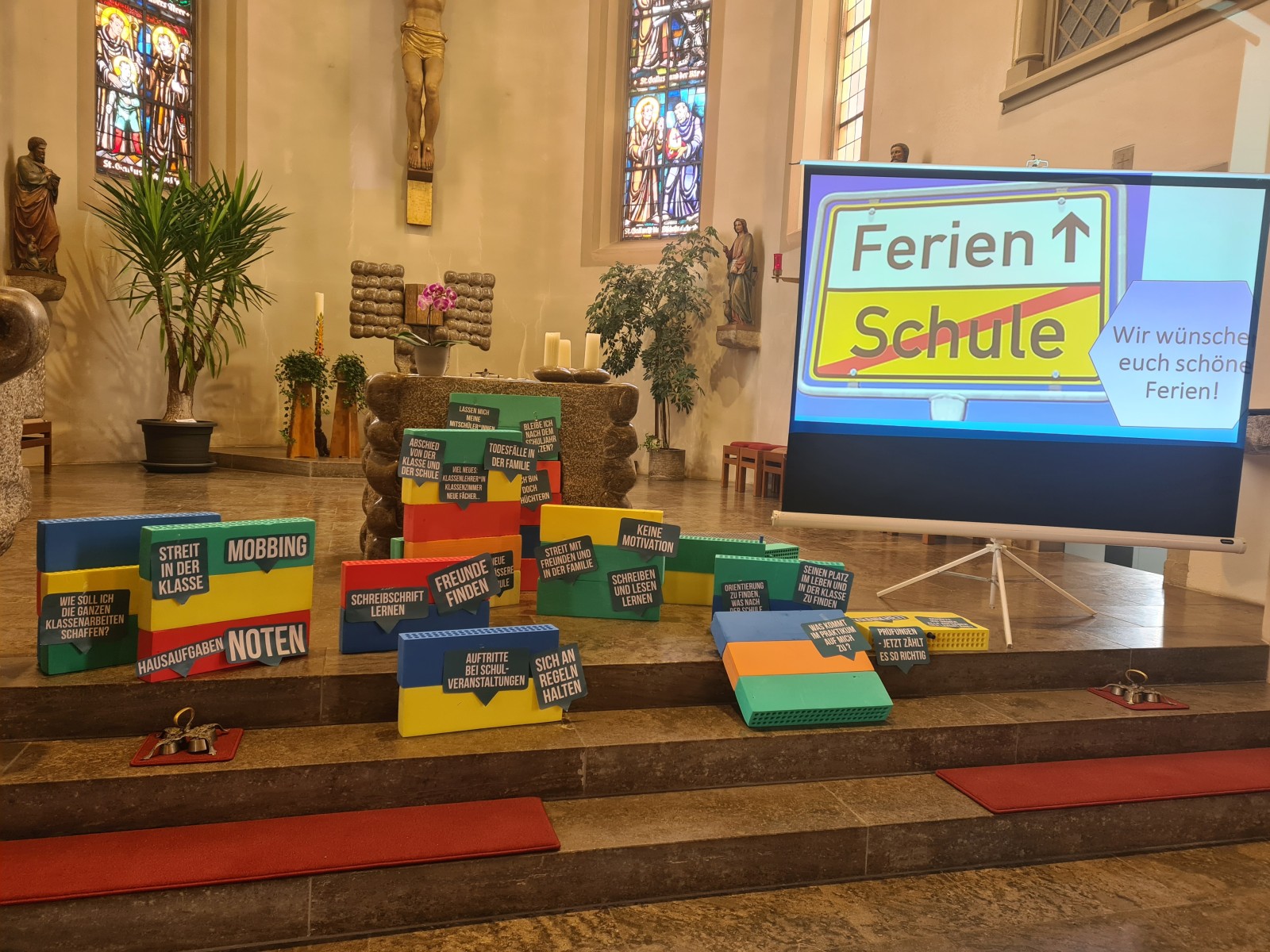 Zum Schuljahresabschluss feierte die GWRS noch einen gemeinsamen Gottesdienst. Dieser stand unter dem Thema "Es ist geschafft". Alle Schulklassen hatten im Laufe des Schuljahres unterschiedliche Hürden zu bewältigen. Diese wurden gesammelt und vorne bildlich dargestellt. Auch Jesu Jünger hatten bei ihrer Aussendung einige Herausforderungen vor sich. Doch nicht nur sie, sondern auch die Schüler*innen können nun stolz auf das zurückblicken, was sie alles geschafft haben. Die Hürden wurden nicht nur bewältigt, sondern auch durch verschiedenste Highlights ergänzt. Zum Abschluss wurde die Schulgemeinschaft unter Gottes Segen in die Ferien entlassen.