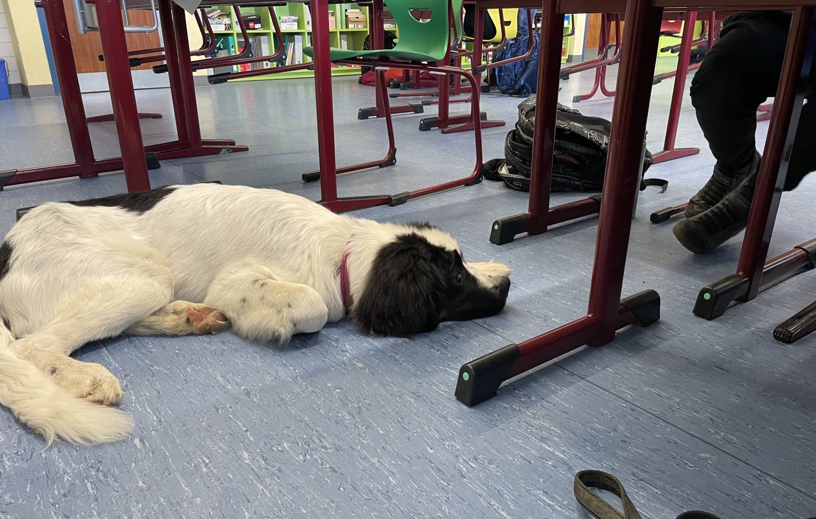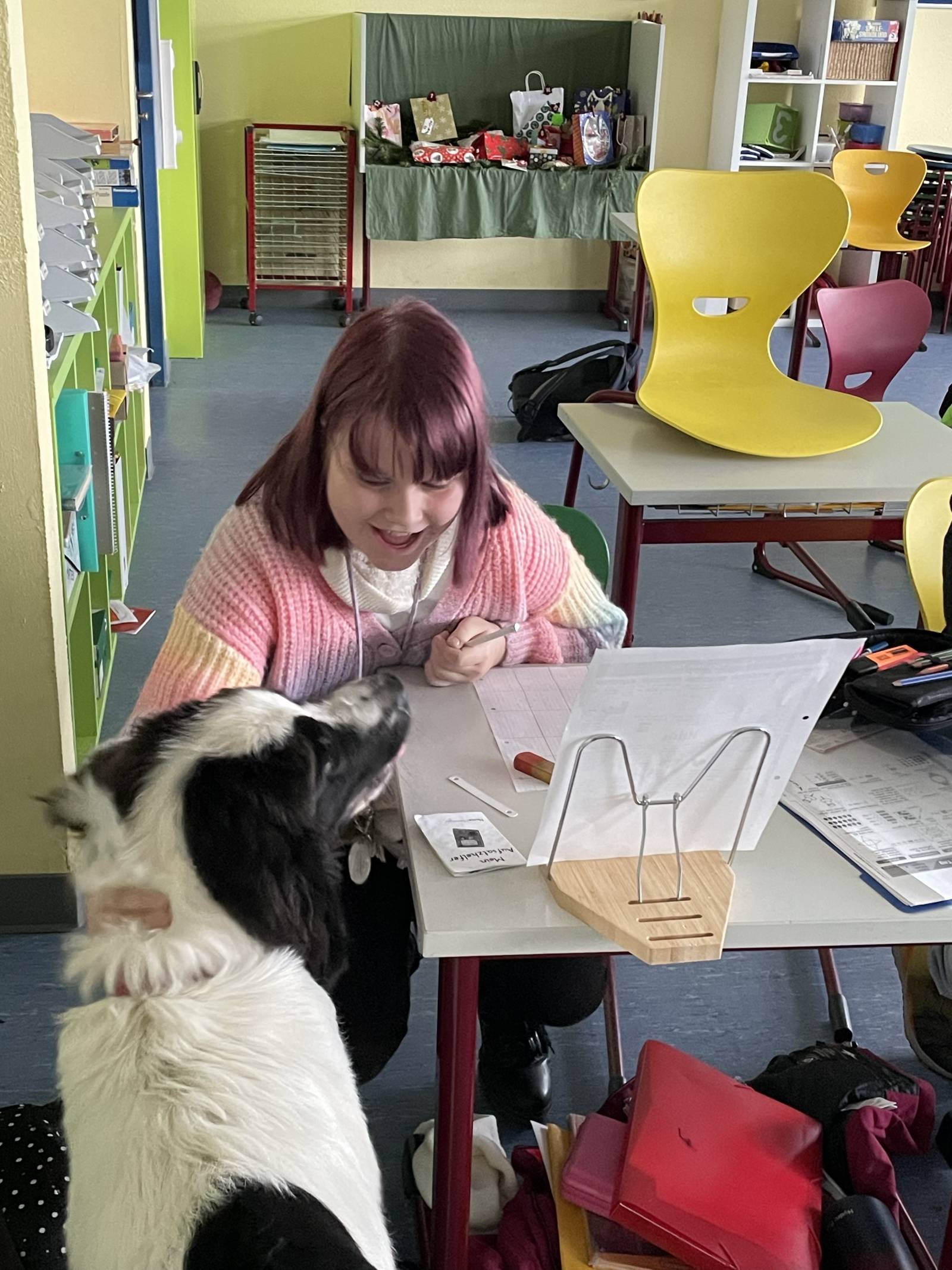 Herrlich! Da wird der Boden extra für sie saubergemacht, es ist still, damit sie schlafen kann und sie bekommt Streicheleinheiten, wenn eine Schülerin oder ein Schüler einfach mal kuscheln möchte.