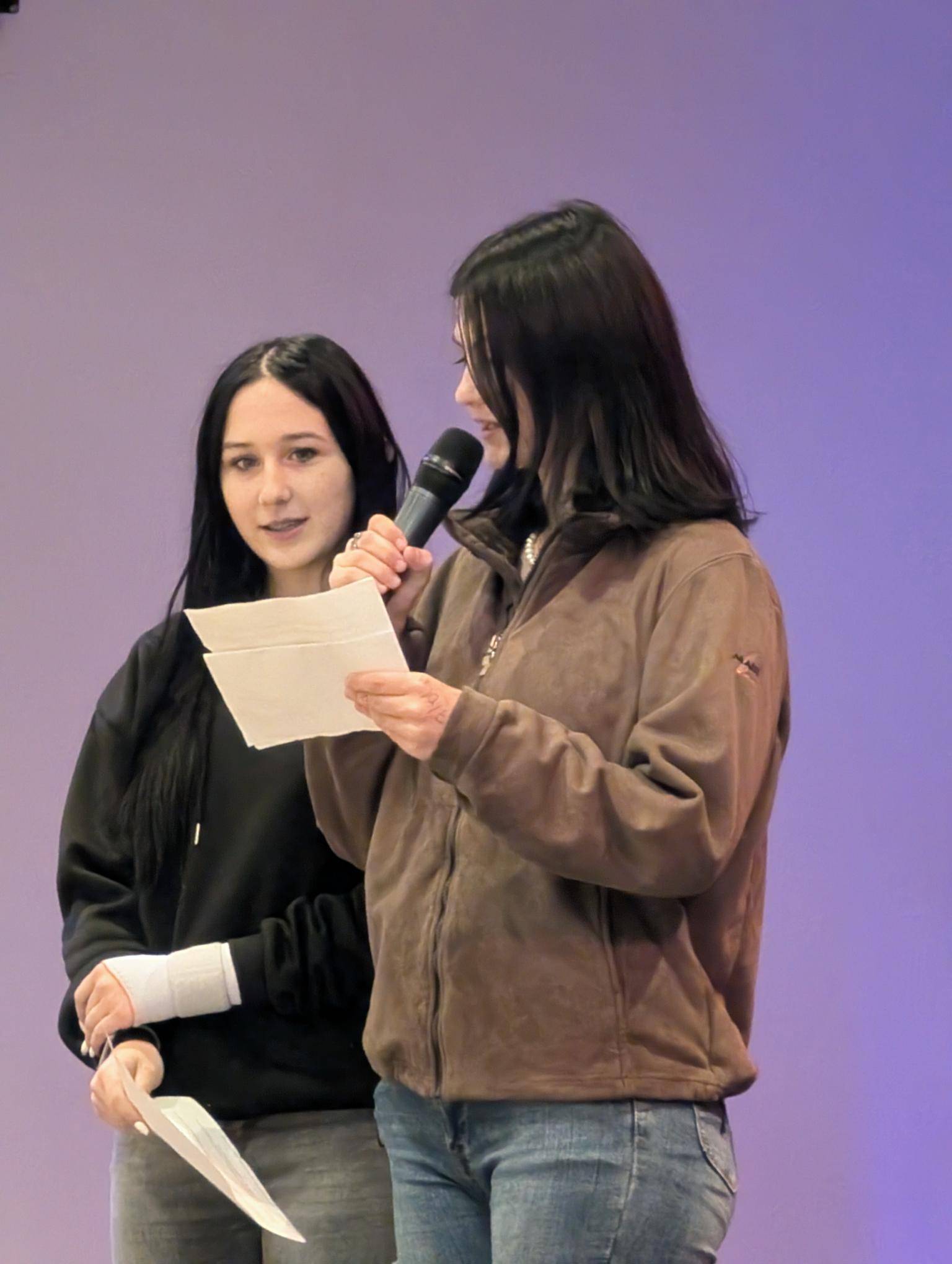 Die Moderatorinnen Ann-Kathrin Scharnetzki und Celia Kopf, die durch das Programm führten, baten auch sogleich die zweiten Klassen auf die Bühne, die mit dem Lied „Das schaffst du!“ für gute Stimmung sorgten.