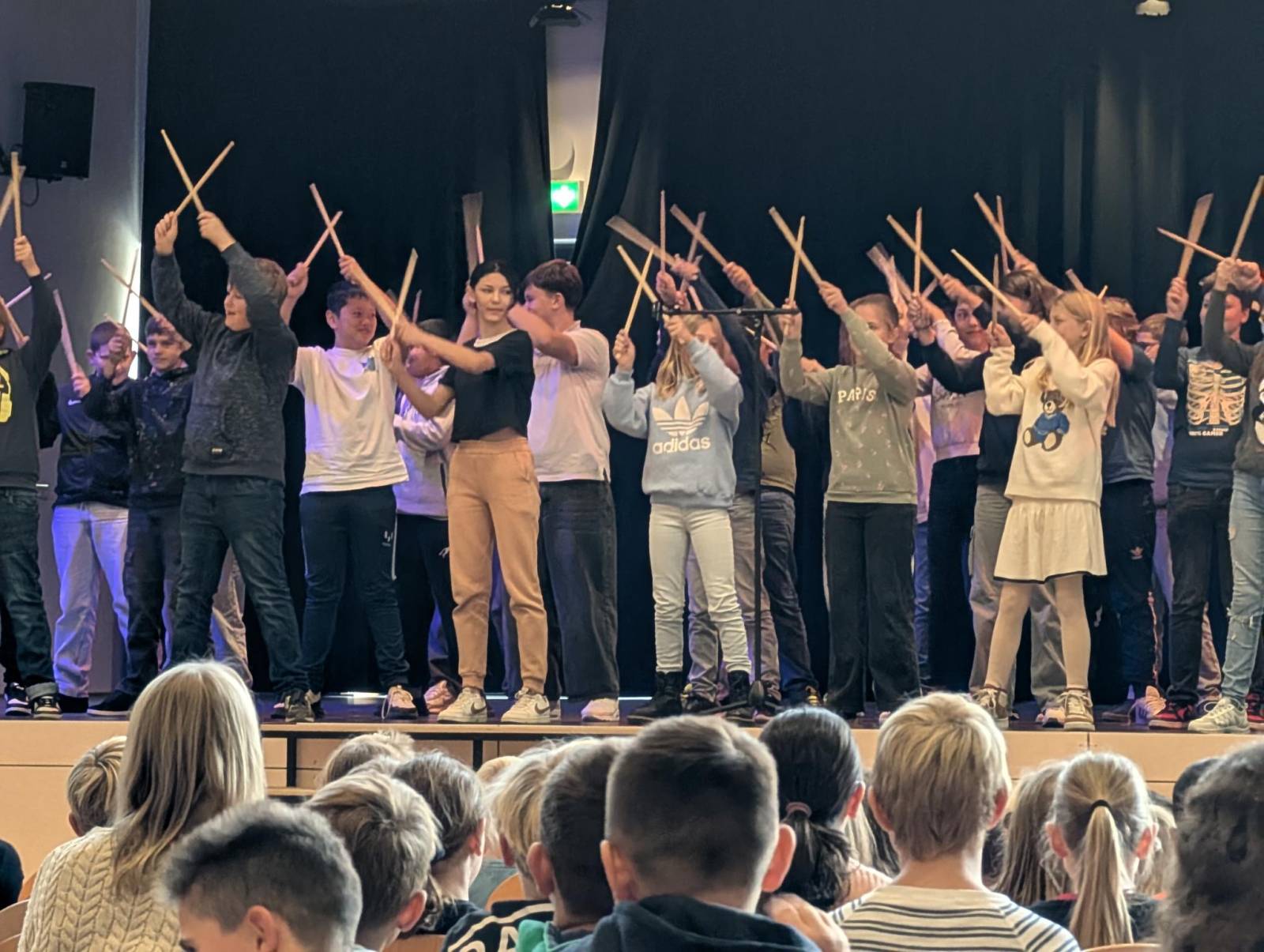 Danach präsentierten die beiden sechsten Klassen unter Einsatz von Schlagzeugsticks das Lied „APT“, bei dem ebenfalls zahlreiche Schülerinnen und Schüler mitsangen.