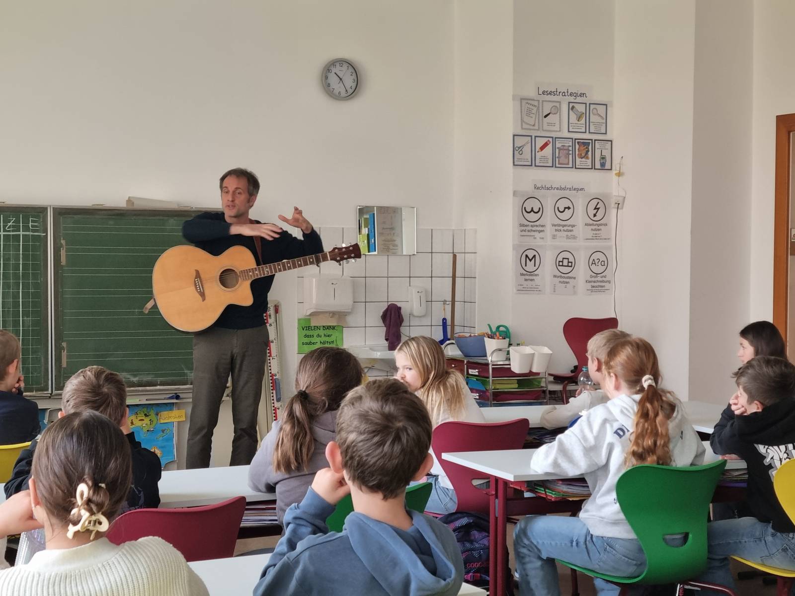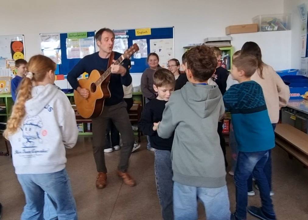 Mit seiner Gitarre im Gepäck begeisterte er die Schülerinnen und Schüler, indem er Lieder in verschiedenen Sprachen sang. Dabei kam heraus, dass es auf der Welt über 7000 unterschiedliche Sprachen gibt, die größtenteils vom selben Ursprung abstammen und sich sogar ähnlich sind. Anhand von mitgebrachten Bildern wurde überprüft, ob die Kinder schwäbische Begriffe verstehen und auch zuordnen können. Mit einem Wörterquiz wurde das erworbene Wissen getestet und die Aussprache der schwäbischen Wörter geübt. Anschließend durften die Kinder auch noch das Tanzbein schwingen und sich zum Lied Jakob ist ein Zottelbär bewegen. Danach wurden in Gruppen verschiedene Bilder auf schwäbisch beschrieben und die restlichen Kinder mussten erraten, welches Bild gemeint war. Mit einem schwäbischen Lied und unter tosendem Applaus verabschiedete sich Pius Jauch.